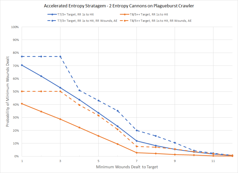 To examine the impact, we'll take a look at a Plagueburst Crawler firing a pair of entropy cannons under two conditions. Under the first condition (solid lines) the Crawler will have no bonuses but be within the re-roll arc of a Chaos Lord. In the second scenario (dashed lines) the Crawler will have Accelerated Entropy applied and the Chaos Lord will have Arch-Contaminator to allow wound rolls to be re-rolled. This is a viable approach thanks to the Plaguechosen Stratagem which costs 1 CP to apply a Warlord trait to a second Death Guard CHARACTER. Toss on the Ironclot Furnace and you have an extremely potent combination. The results are simulated against a T7/3+ target as well as a T8/5++ target.