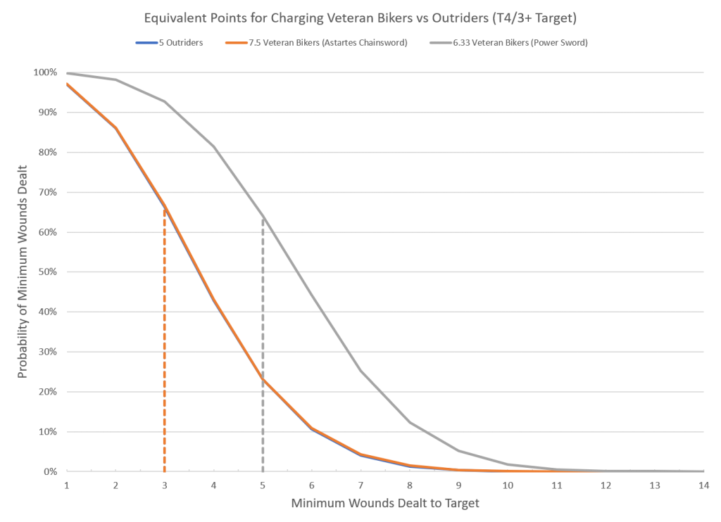 In terms of survivability the Outrider has 33% more wounds for 50% more points, but this does not reflect the complete picture. The actual impact depends on the Damage characteristic of the attack. Against D1 weapons the Outrider is tougher, but both require two shots from D2 weapons to be destroyed. Obviously against D3 weapons the Outrider has an advantage, so in the end your local meta will likely determine whether or not the points are worth it. Offensively the Outrider will get 6 attacks on the charge with an Astartes chainsword while the Veteran Biker will get 4, so the difference in output is identical to the difference in price. In other words, for the points the Veteran Bikers are competitive (if not superior) to Outriders. Can we do better? If we spend 5 points on a power sword the Veteran Bikers will lose an attack but gain a bonus to AP and strength that may be helpful against a typical T4/3+ target.