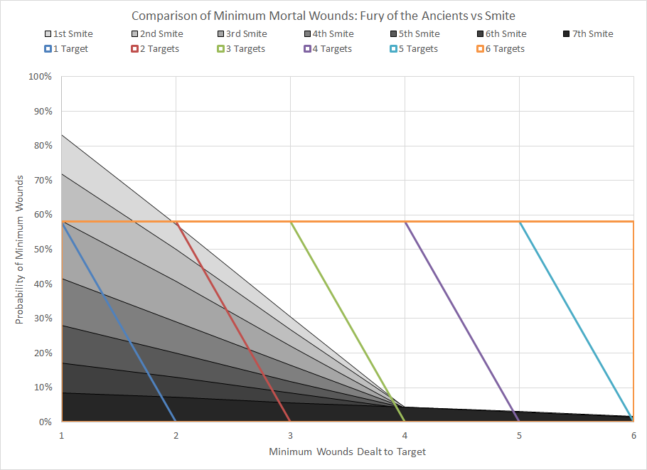 Comparison of minimum wound probability distribution for Fury of the Ancients and Smite for various numbers of targets underneath the line.Fury of the Ancients deal a fixed number of mortal wounds that's exclusively a function of the number of targets between the caster and an enemy model 12" away. Since the power depends on a simple warp charge 7 Psyker test the probability of success is fixed at 58%, so as expected if three or more targets can be lined up the total damage output is superior to a casting of Smite. The problem is that in general your goal is to concentrate damage onto a high value target; giving one mortal wounds to three targets is typically less useful than dealing three mortal wounds to one target. As a result this power is generally ignored.