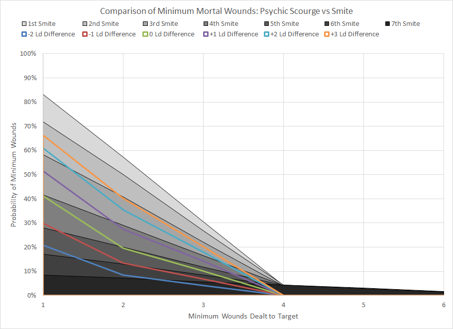 Comparison of minimum wound probability distribution for Psychic Scourge and Smite for various differences in Leadership. A positive difference means that the caster has a higher Leadership than the target.We can immediately see that Psychic Scourge is a fairly mediocre power; even when the caster's Leadership characteristic is 3 points higher than the target, the power performs worse than the first casting of Smite. This is to be expected as Psychic Scourge has a higher warp charge and is also not limited to the closest enemy unit. Space Marines typically have superior Leadership to other targets, but this power is situational at best.