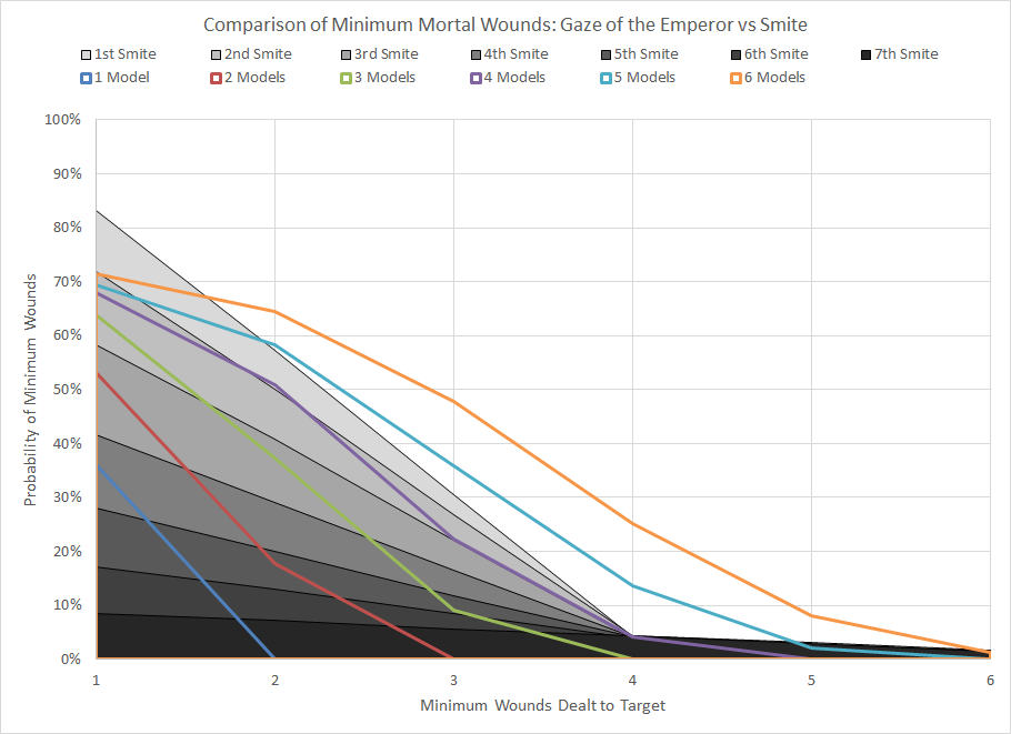 Comparison of minimum wound probability distribution for Gaze of the Emperor and Smite against various quantities of models under the line. Note that because Gaze of the Emperor is a 2d6" length you have minimal control over the number of models affected.Although it's nowhere near the level of Trephination, Gaze of the Emperor is still a garbage power that is too situational and ineffective to be worth taking. The Psykana discipline is better-suited for bolstering Astra Militarum models with Psychic Barrier and Nightshroud.