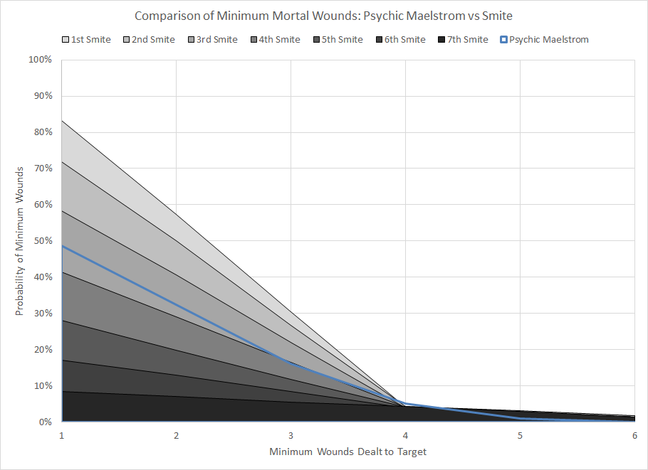 Comparison of minimum wound probability distribution for Psychic Maelstrom and Smite.Psychic Maelstrom is slightly better than casting Smite a fourth time, which is not unexpected given that the power can target any enemy model within range. The combination of fairly high warp charge and the possibility of failing the first die roll means that the power will completely fail to do any damage half the time. Leave the offense to ordnance.