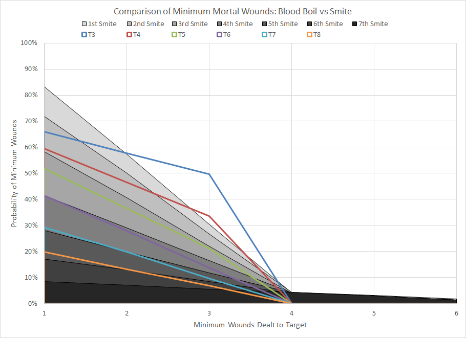 Comparison of minimum wound probability distribution for Blood Boil and Smite for various target Toughness values.Blood Boil is not worth taking. Against any target with a Toughness characteristic greater than 3 you're better off using Smite, and with a cast range of 6" you're probably better off charging the T3 target anyway.