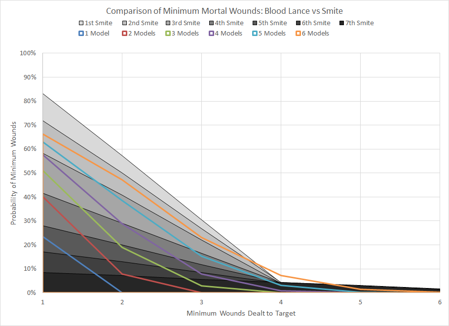 Comparison of minimum wound probability distribution for Blood Lance and Smite for different quantities of models.Blood Lance is a power that could potentially be useful against large concentrations of enemy models, but even if you manage to get 6 models in a line the first casting of Smite has a higher probability of success. This is another power to avoid.