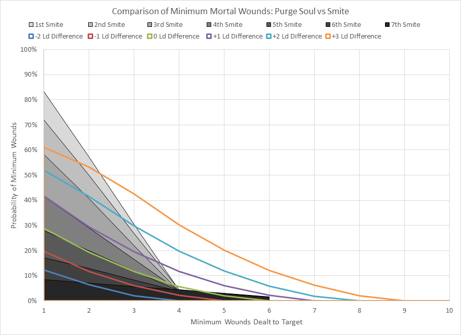 Comparison of minimum wound probability distribution for Purge Soul and Smite for various differences in Leadership. A positive difference means that the caster has a higher Leadership than the target. This chart assumes a Grey Knight caster with a +1 bonus to Psychic tests.Given the presence of so many Space Marines and other high Leadership armies it is unlikely that the Grey Knights player would see anything but a minor bonus to a contested roll. Between the high probability of failure and short range this power is just yet another example of how bad the Grey Knights codex is.