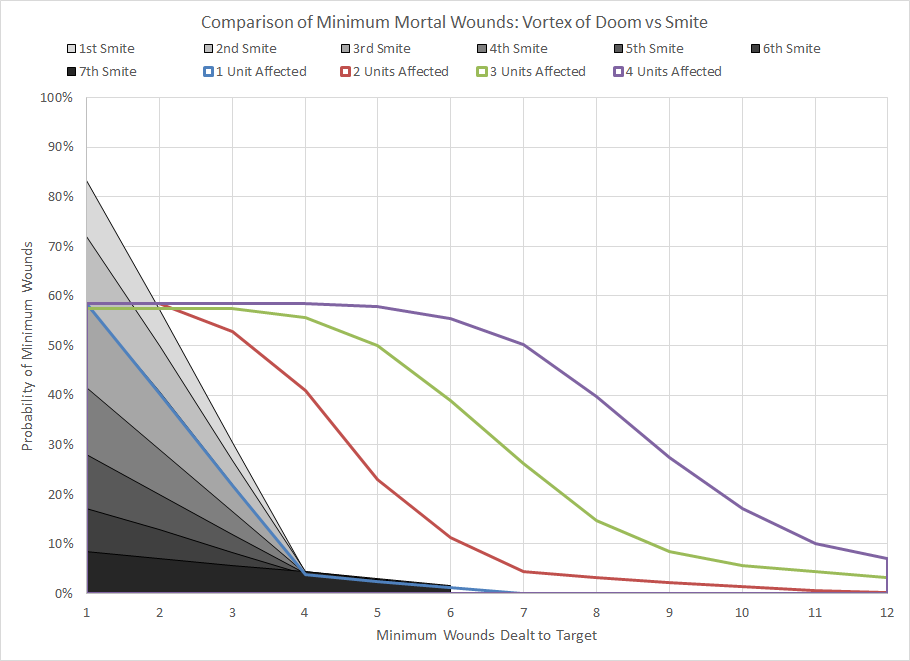 Comparison of minimum wound probability distribution for Vortex of Doom and Smite for various numbers of units affected. This chart assumes a Grey Knight caster with a +1 bonus to Psychic tests.If only one target is affected then Vortex of Doom is equivalent to casting Smite a third time at a reduced range. Against opponents who have multiple units clumped together (such as a dense castle of vehicles surrounding an Ironstone bearer) then there is a significant potential for damage as you effectively cast Smite on each target. It may be worth considering the use of a Grey Knight Psyker in an auxiliary support detachment, as he can potentially teleport in and have his power bolstered by the Psychic Channeling Stratagem (1 CP to roll 3d6 and pick the two highest) to have a high chance of success. At the very least it would force your opponent to alter his deployment and placement strategy in order to minimize the number of units close to each other. This could be accomplished for as little as 80 points with Castellan Crowe or 66 points with a Techmarine.