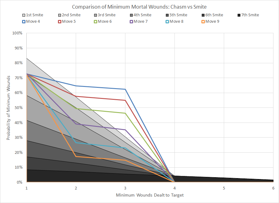 Comparison of minimum wound probability distribution for Chasm and Smite against various Movement characteristics.Another surprisingly powerful ability which can do significant damage to targets with low movement. Anything that has a Move characteristic of 6 or less is likely going to get at least two mortal wounds, and unlike many Smite-like powers Chasm is guaranteed to deal at least one mortal wound to the target. Combined with the one mortal wound dealt for a successful manifestation of Tenebrous Curse, you can reliably expect to deal 4 mortal wounds to a visible target.
