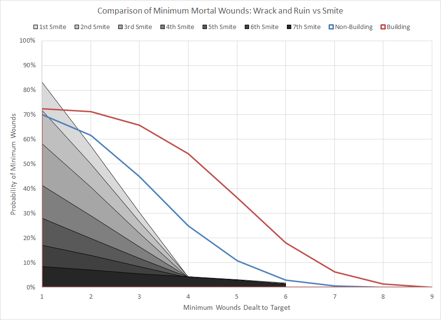 Comparison of minimum wound probability distribution for Wrack and Ruin and Smite for building and non-building targets.You can basically ignore the red line as buildings are extraordinarily rare, but in any scenario where it's reasonable to expect targets in terrain Wrack and Ruin is superior to Smite. This is an example of how situational powers should be in Warhammer 40K. Instead of burdensome requirements that result in a terrible outcome, you have a situational power with a significant chance of doing a large amount of damage. This power also has the advantage of forcing your opponent to reconsider his deployment and placement strategy, and balance the risk of mortal wounds with the benefits of cover. For actual Imperial Fists (who ignore cover) this calculation vastly favors avoiding terrain and the power may not be as relevant.