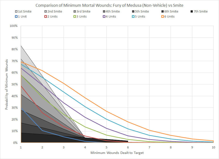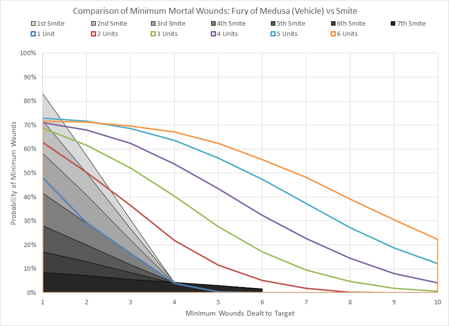 Comparison of minimum wound probability distribution for Fury of Medusa and Smite for different quantities of non-vehicle targets.