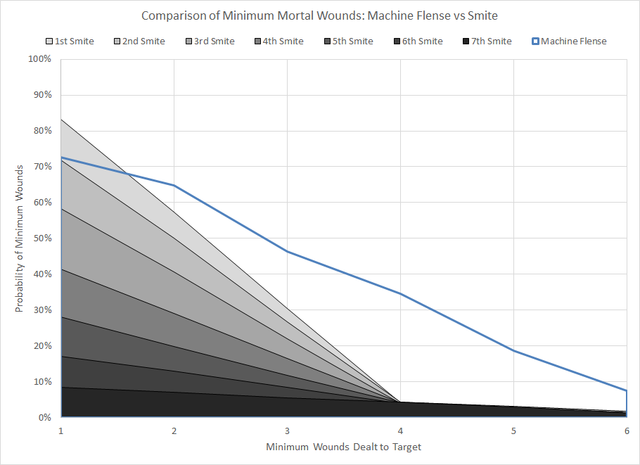 Comparison of minimum wound probability distribution for Machine Flense and Smite; this chart assumes a second target is within 6" for the secondary mortal wounds.If the enemy force has any vehicles then Machine Flense is one of the rare mortal wound-dealing psychic powers which is actually comparable (if not strictly superior) to Smite. With a 72% chance of dealing damage and a high probability of dealing additional mortal wounds to a nearby target this power could potentially be very useful. Obviously this power is useless against Tyranids or any force that has few or inaccessible vehicles (or that has a bunch of units that should be vehicles, but instead have the BATTLESUIT keyword).