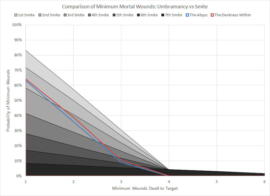 Comparison of minimum wound probability distribution for Umbramancy powers and Smite.It's a good thing that the other options in the Umbramancy discipline are solid because these two Smite alternatives are pretty poor. Both powers have a roughly 36% chance of not dealing any damage at all due to the combination of warp charge and randomness associated with each potential mortal wound. The Darkness Within is particularly bad as the mortal wounds must be distributed across multiple targets, eliminating any potential for focused damage on a high-value target.