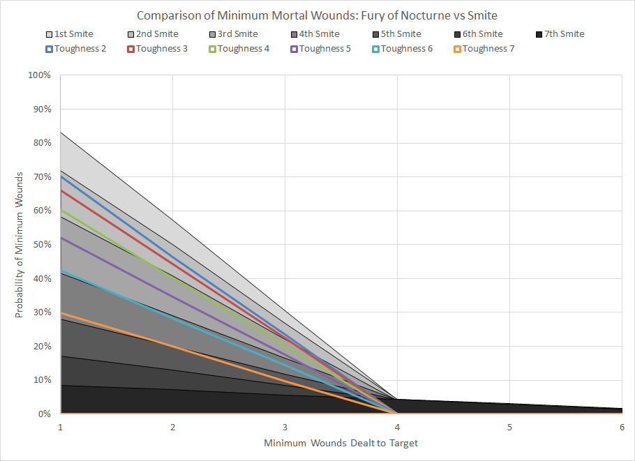 Comparison of minimum wound probability distribution for Fury of Nocturne and Smite against various Toughness characteristics.Fury of Nocture is ultimately an incredibly situational power which is insufficiently deadly for the level of unpredictability that the power contains. You're better off avoiding this one.