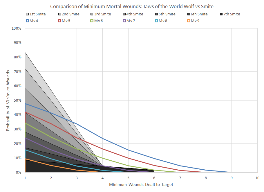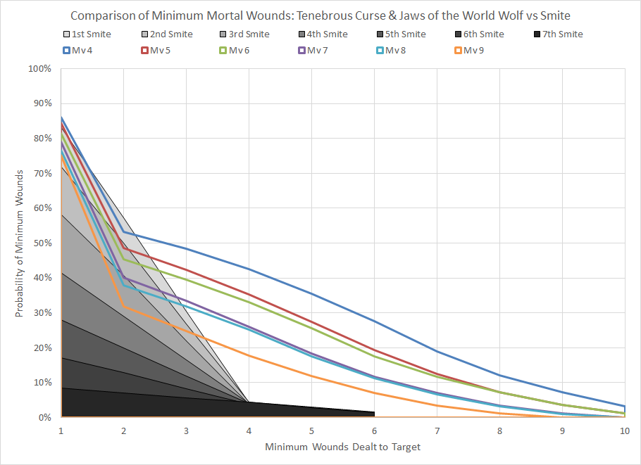 Comparison of minimum wound probability distribution for the combined casting of Tenebrous Curse and Jaws of the World Wolf and Smite against various Movement characteristics.This particular combination does indeed improve the probability of dealing damage to the target, outperforming Smite (although it does require two Psykers to perform). That said, a roughly 35% chance to deal 4 mortal wounds to a target with a Move characteristic of 5 or 6 is certainly notable. This could be further improved by getting a bonus to cast Jaws of the World Wolf through the use of Njal Stormcaller or the Empyric Channeling Stratagem.