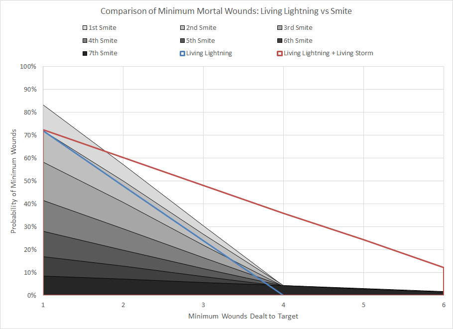 Comparison of minimum wound probability distribution for Living Lightning and Smite with and without Living Storm Stratagem. This chart assumes that the target is not destroyed and so there are no additional wounds.By itself Living Lightning is comparable to the second casting of Smite, although the chart above does not include the bonus mortal wounds associated with killing the first target. When the mortal wounds dealt is increased to 1d6 via the Living Storm Stratagem the power becomes significantly more effective, although the circumstances required to do this (three Librarians and 1 CP) make it a costly endeavor.
