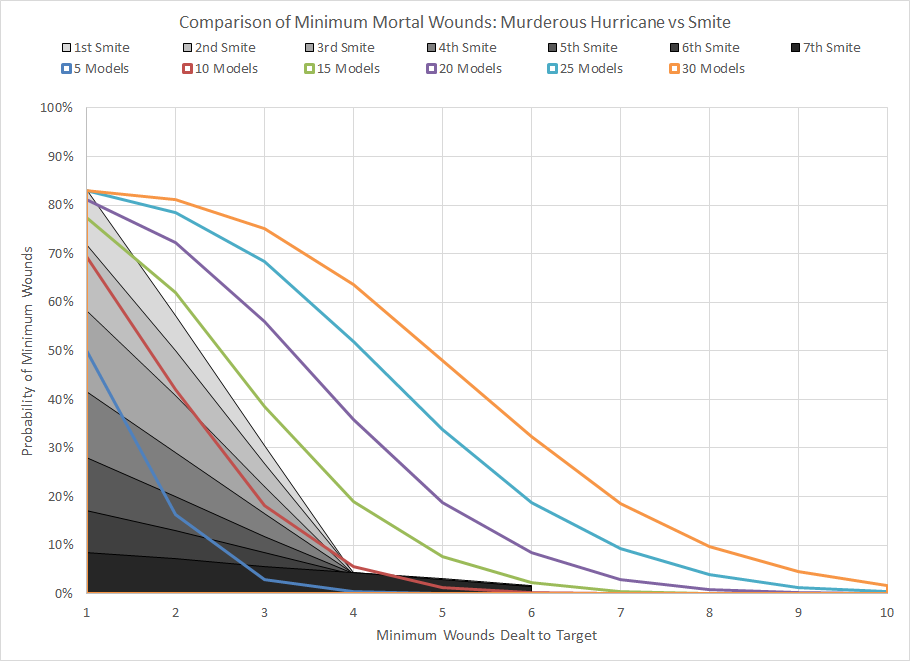 Comparison of minimum wound probability distribution for Murderous Hurricane and Smite against various numbers of models.With a warp charge value of only 5 Murderous Hurricane is arguably the best of the mob-targeting powers, but it is still a situational power that requires at least 10 to 15 models in the target unit to be a better option than Smite.