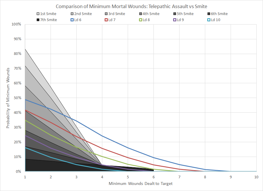 Comparison of minimum wound probability distribution for Telepathic Assault and Smite for different Leadership characteristics.Telepathic Assault is an extremely mediocre power. Not only does the high warp charge mean that the power will succeed only 58% of the time, but you then run the considerable risk of dealing no damage at all if you roll equal to or less than the target's Leadership. There may be an edge use case against targets with severely reduced Leadership characteristics, but those types of combined effects generally require careful maneuvering or have a low probability of success.