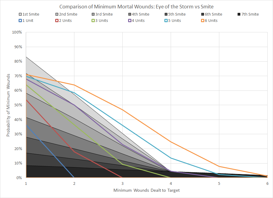 Comparison of minimum wound probability distribution for Storm of the Emperor's Wrath and Smite for various numbers of models in the target unitSince both Storm of the Emperor's Wrath and Smite target the nearest enemy unit we can make a direct comparison between the two powers. We quickly see that below 15 models Smite is unquestionably a superior power; Storm of the Emperor's Wrath simply doesn't provide enough opportunities to reliably deal more mortal wounds. This changes at higher quantities; although the probability of dealing any damage at all is fixed at 72% since the warp charge value is 6, the probability of dealing more wounds makes this is a viable option against horde armies. Ideally this power (and those that are functionally identical in other factions) would be used against units with 15 or more models.