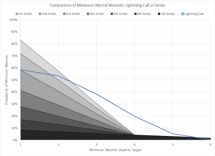 Comparison of minimum wound probability distribution for Lightning Call and Smite.As far as Smite clones go Lightning Call actually isn't too bad. With a warp charge value of 7 the probability of dealing any damage is only 58%, but the average number of wounds dealt to the target on a successful cast is higher than Smite due to the sequential additional rolls. The expected value of a successfully manifested Lightning Call is 3 mortal wounds.