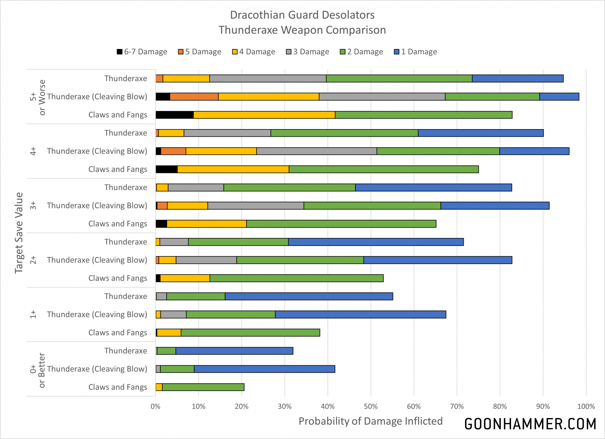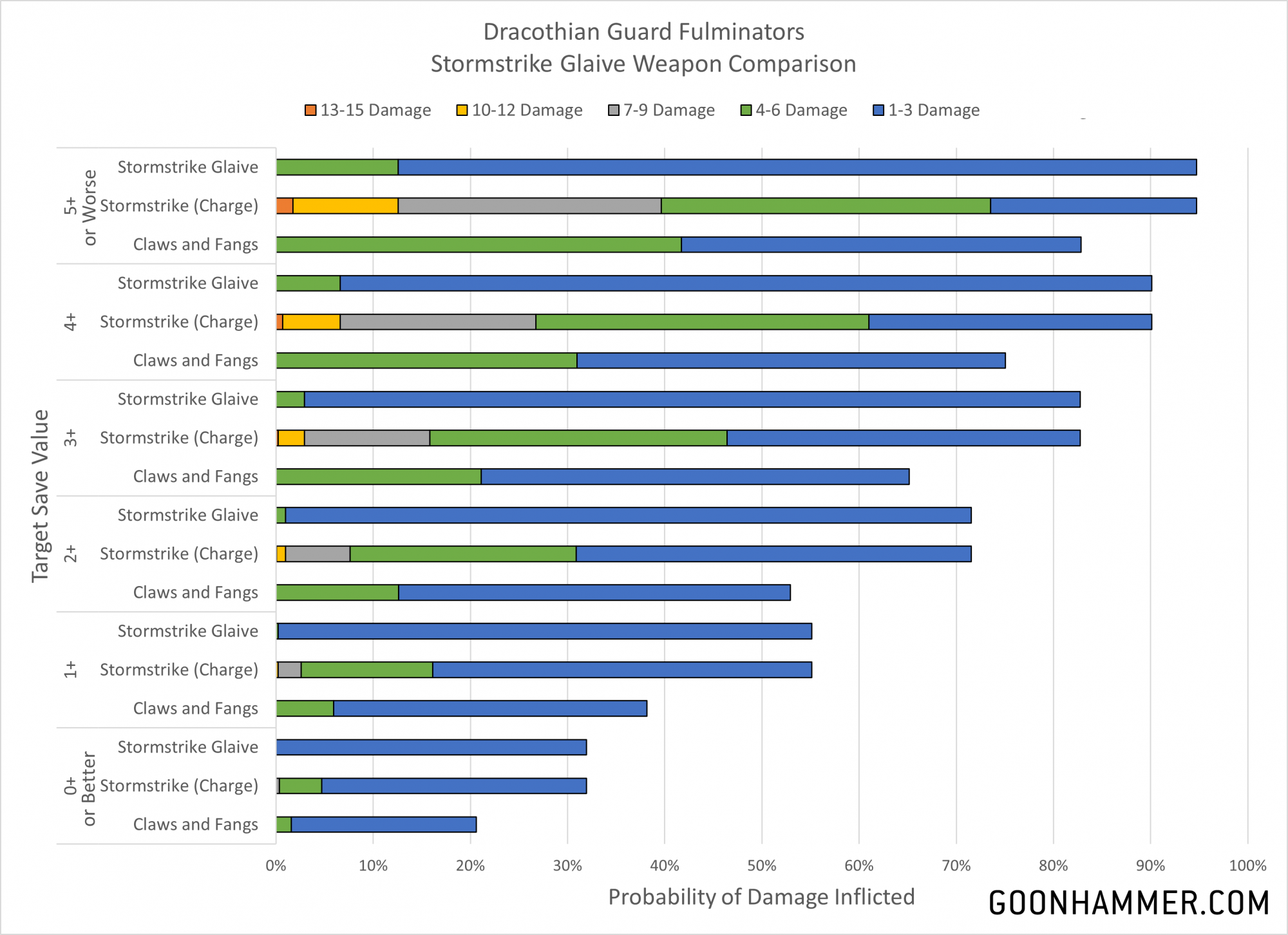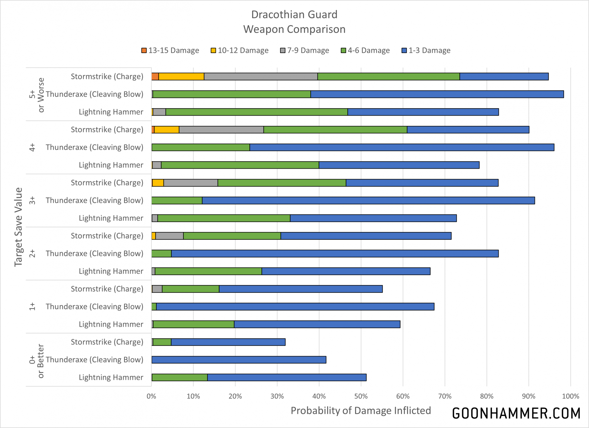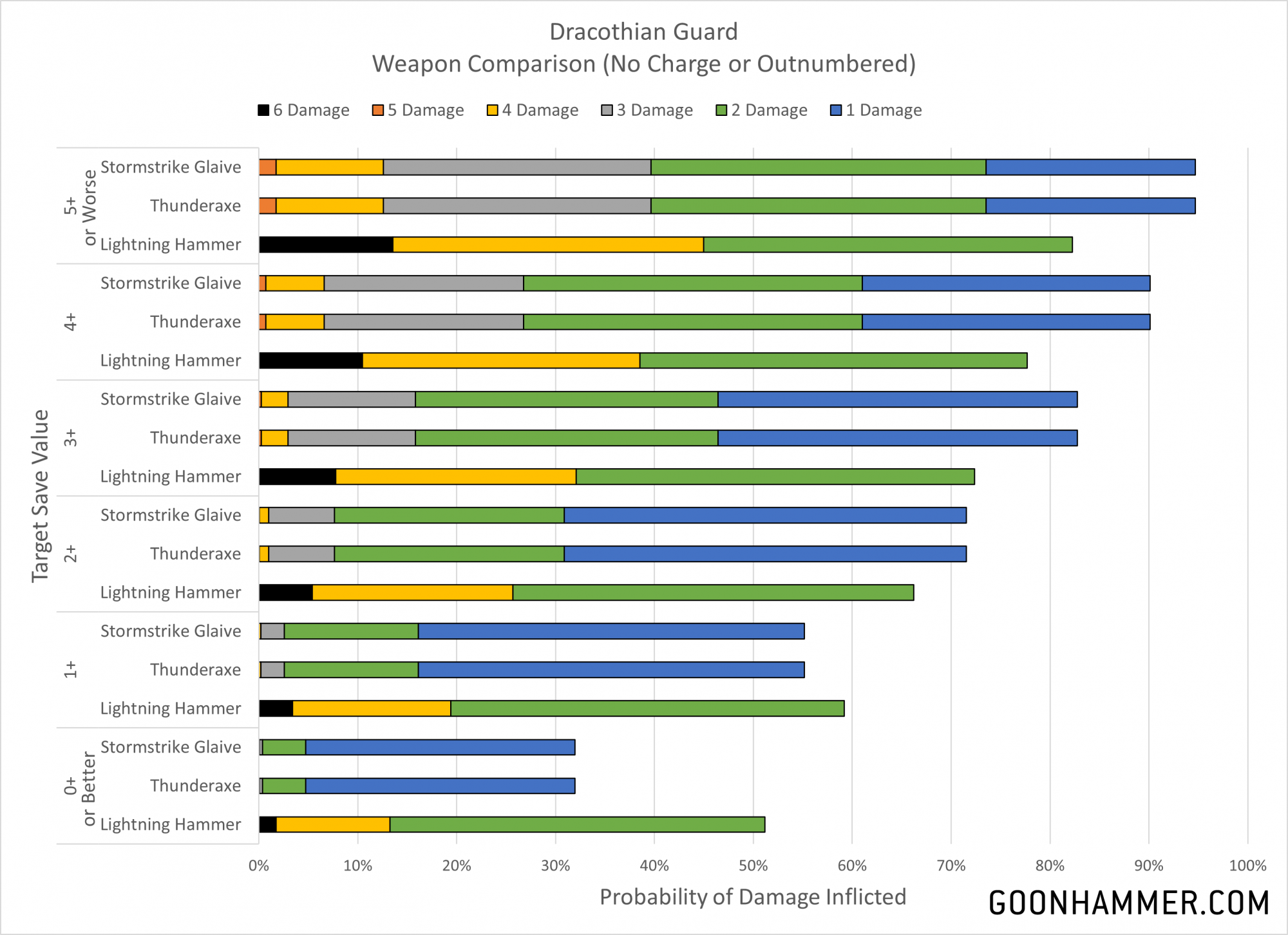 What happens if we look at situations where the weapons can use their benefits? The Lightning Hammer is unchanged since its ability is always used, but we can see how the Thunderaxe and Stormstrike Glaive change in the chart below. The first takeaway is that the Lightning Hammer is better than the Thunderaxe even against larger units; the additional damage and possibility of mortal wounds simply makes it more effective. The second is that the the Stormstrike Glaive on the charge is significantly better against every save except for one; when the target is guaranteed to save on a 2+. In that situation the Lightning Hammer is slightly better.
