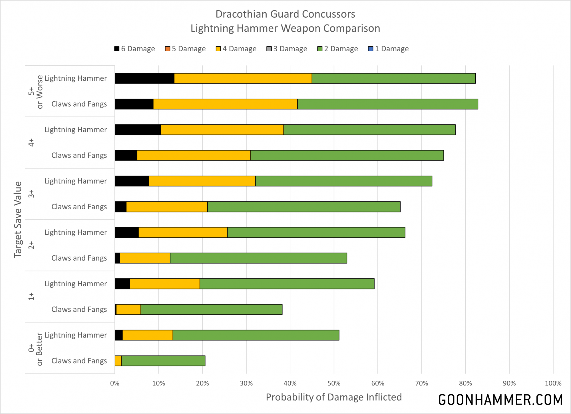 First up are the Concussors, which cleverly enough are equipped with a Lightning Hammer. The Lightning Hammer has the same profile as the Claws and Fangs that every Dracoth comes with; 3 attacks that hit and wound on a 3+, have -2 Rend, and deal 2 damage. The difference is that the Lightning Hammer also have the Blast to Ashes special rule, which automatically inflicts 2 mortal wounds on an unmodified hit roll of six and then ends the attack sequence. The chart below shows the wounds, with one caveat. AnyDice calculates results based on sequences of numbers, and it's very challenging to add a circumstance where an attack deals mortal wounds and ends. As a result the charts below are off by about 3% for the Lightning Hammer attacks. The bottom line is that Lightning Hammers are a very reliable source of damage, averaging at least 2 wounds against even a target that saves on a 2+.