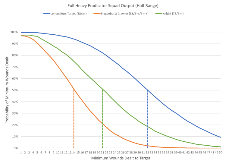 A full squad of six Eradicators armed with heavy melta rifles and two multi-meltas comes out to 280 points. We'll take a look at how much damage that can deal to a variety of representative high value targets such as a Knight, Tank Commander, and a Plagueburst Crawler. We'll assume that the attacker was able to position themselves to be within half range, and that there are no movement penalties courtesy of one of the myriad of Stratagems and abilities that enable it.