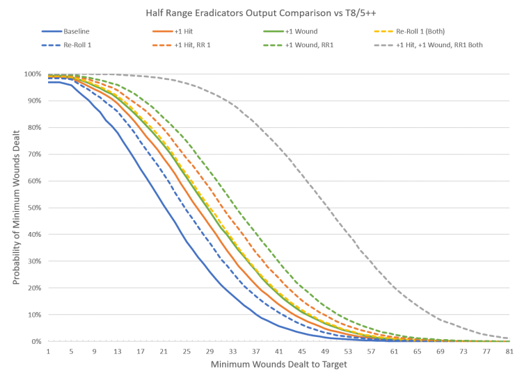 The most common effects are +1 to hit, +1 to wound, and re-rolling 1s to hit and wound. We'll use a T8 target with a 5++ invulnerable since we already know T8/3+ is destined to be murdered and there are a lot of targets with a 5++ profile. From the first article in Hammer of Math we know that there's no difference between re-rolling a 1 to hit or 1 to wound; both have the same change in the overall probability. Again we assume that there are no movement penalties.