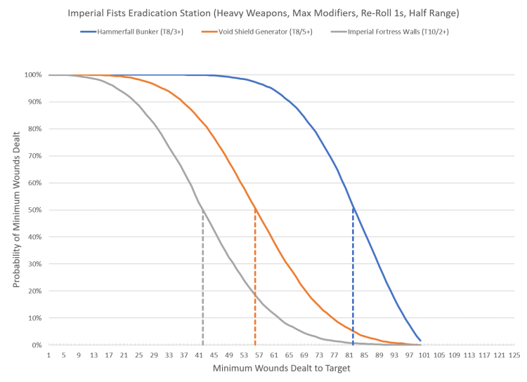 For those who are curious, the Imperial Fortress Walls have 40 wounds and cost 898 points. A single squad of Imperial Fists Eradicators will deal enough wounds to kill, on average, five Hammerfall Bunkers.