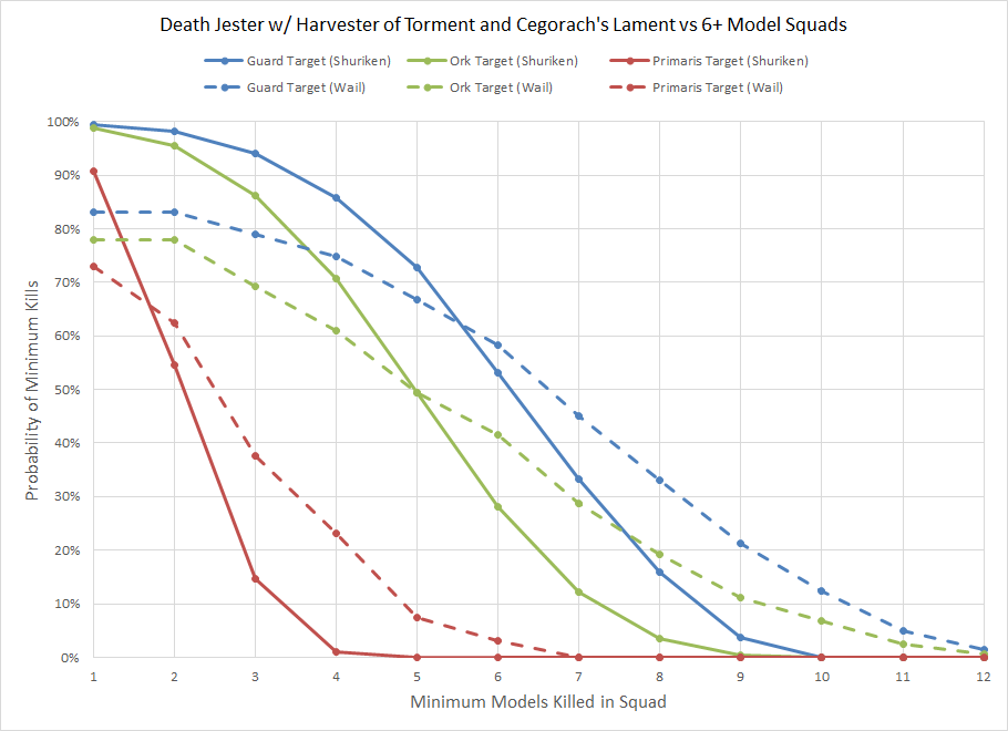 In every case we see that the probability of killing a single model with the shuriken profile, but the potential for a cascade of mortal wounds means that for killing larger numbers of units the wail profile is superior. This is precisely why Mythic Role is perfect for a Death Jester; the chance of hitting goes from 83% to 97% assuming you're forced to use the re-roll to hit, but most of the time you won't need to and the re-roll will instead be applied to a wound roll. The results above don't include the high potential for additional casualties thanks to the penalty from Leadership. If you're feeling particularly cruel you can add a second Death Jester with Curtainfall who has to only kill a single model with either profile to cause an additional -2 penalty to Leadership (Corrode: again, this is all contingent on Harvester not being FAQed).