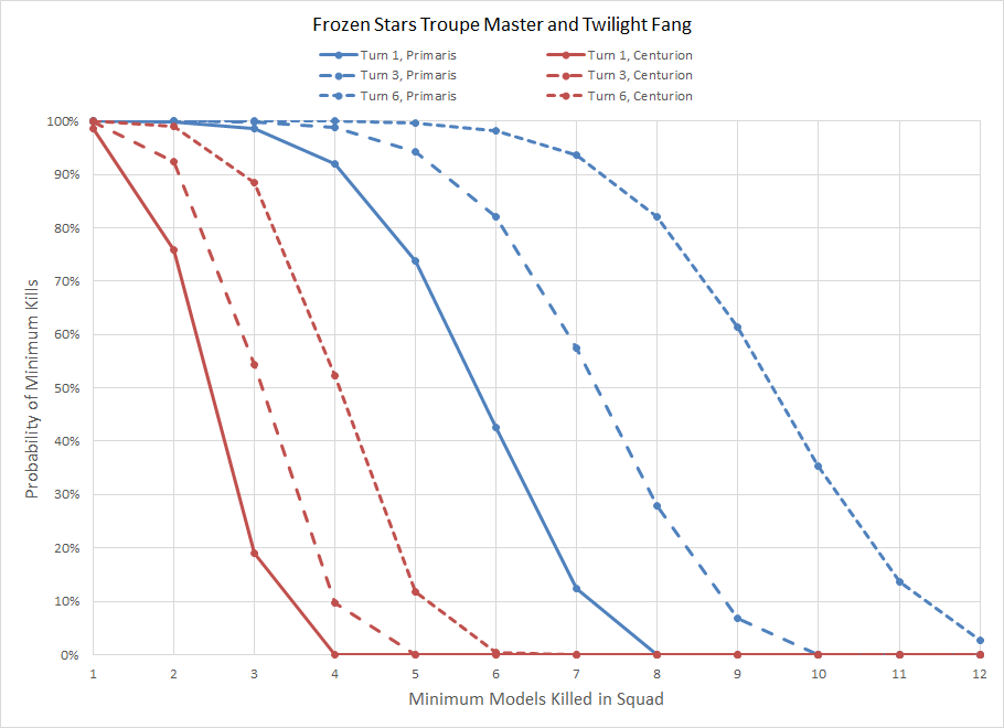 Rather than go all out, we can focus on a more reasonable approach and simply look at what a Frozen Stars Troupe Master will do by himself given Choreographer of War and The Twilight Fang against a Primaris (T4/3+/2W) or Centurion (T5/2+/4W) target. We see below that even on the first turn the Troupe Master is practically guaranteed to earn its points back against Intercessor or Centurion targets, and as the turns escalate things can get even more egregious. Add Darkness Bites using the Pivotal Role Stratagem and you're guaranteed an additional Intercessor kill and a 50% chance of adding another Centurion thanks to the two mortal wounds. Since the targets have an even number of wounds there's no reason to use Murderous Entrance.