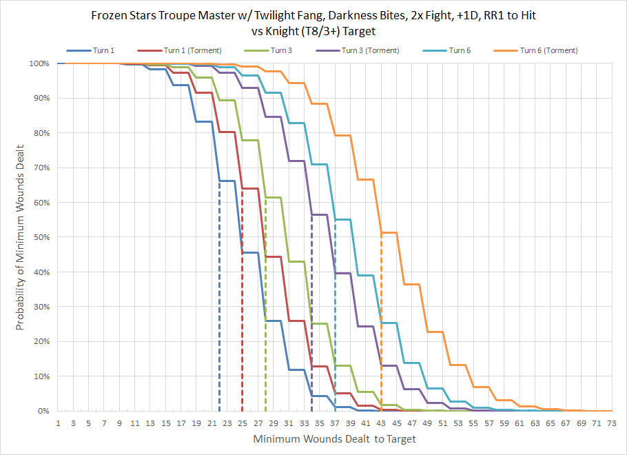 One might be inclined to wonder if the sheer volume of attacks available to a Troupe Master could give it a shot at hurting a serious target like a Knight in melee (T8/3+/24W). To maximize our chances of success we would want to use Pivotal Role to apply Darkness Bites for the guaranteed two mortal wounds, which will be doubled to four mortal wounds once we fight twice using War Dancers. We'll also apply Luck of the Laughing God to maximize the number of hits that land on the target, and finally we'll definitely need Murderous Entrance for the extra damage. If the Troupe Master is injured Malicious Frenzy will be helpful for getting an extra two attacks, although the +2S bonus will be irrelevant since the target is T8 and S7 wounds the same as S5.