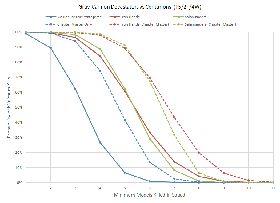 Against a non-VEHICLE target like Centurion Devastators things get a little more interesting. Imperial Fists lose all of their bonuses completely, being relegated to the same corner as White Scars and Black Templars. That said they're still effective, hitting the Centurions and having a slightly better than 60% chance of killing enough to get their points back. The Iron Hands and Salamanders really shine, with a chance of wiping out an entire six man squad that's improved considerably with Chapter Master or Captain support.