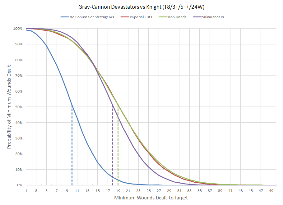The first target is the ubiquitous Imperial Knight. While not nearly as popular as they were in the past, they still represent a solid target and there are a lot of T8/3+ things that also have an invulnerable save. Here we see that the 215 points get you a LOT of viability, with all three of the beneficiary factions averaging 18 or 19 wounds. Add a Captain to re-roll 1s to hit and the 50% mark goes up by 3 wounds to 21 or 22 (which makes sense as re-rolling 1s adds a flat 17% bonus to the expected value). Make the support a Chapter Master and Salamanders stay around 21 wounds (since between re-rolling 1s and their Chapter Trait they were pretty much set), Iron Hands average 24 wounds, and Imperial Fists average 27 wounds and have a 66% chance of killing a Knight in a single turn. Not bad for 215 points and some support. Both Salamanders and Iron Hands remain threats well past turn 1; it's not infeasible to imagine an opponent bringing 645 points of Devastators and repeating the process three turns in a row.