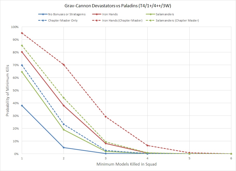This might be enough of a threat to warrant looking at one of the toughest things to kill in the game; the Paladin Bomb. The challenge here is the combination of high invulnerable save, significant penalties to hit, and damage reduction. Unfortunately from the chart below we see that things aren't looking too good; even with a Chapter Master to offset the hit penalties there is effectively no chance to kill enough Paladins to get your points back. You're much better off using this unit to threaten other parts of the army, particularly since you can easily outmaneuver them.