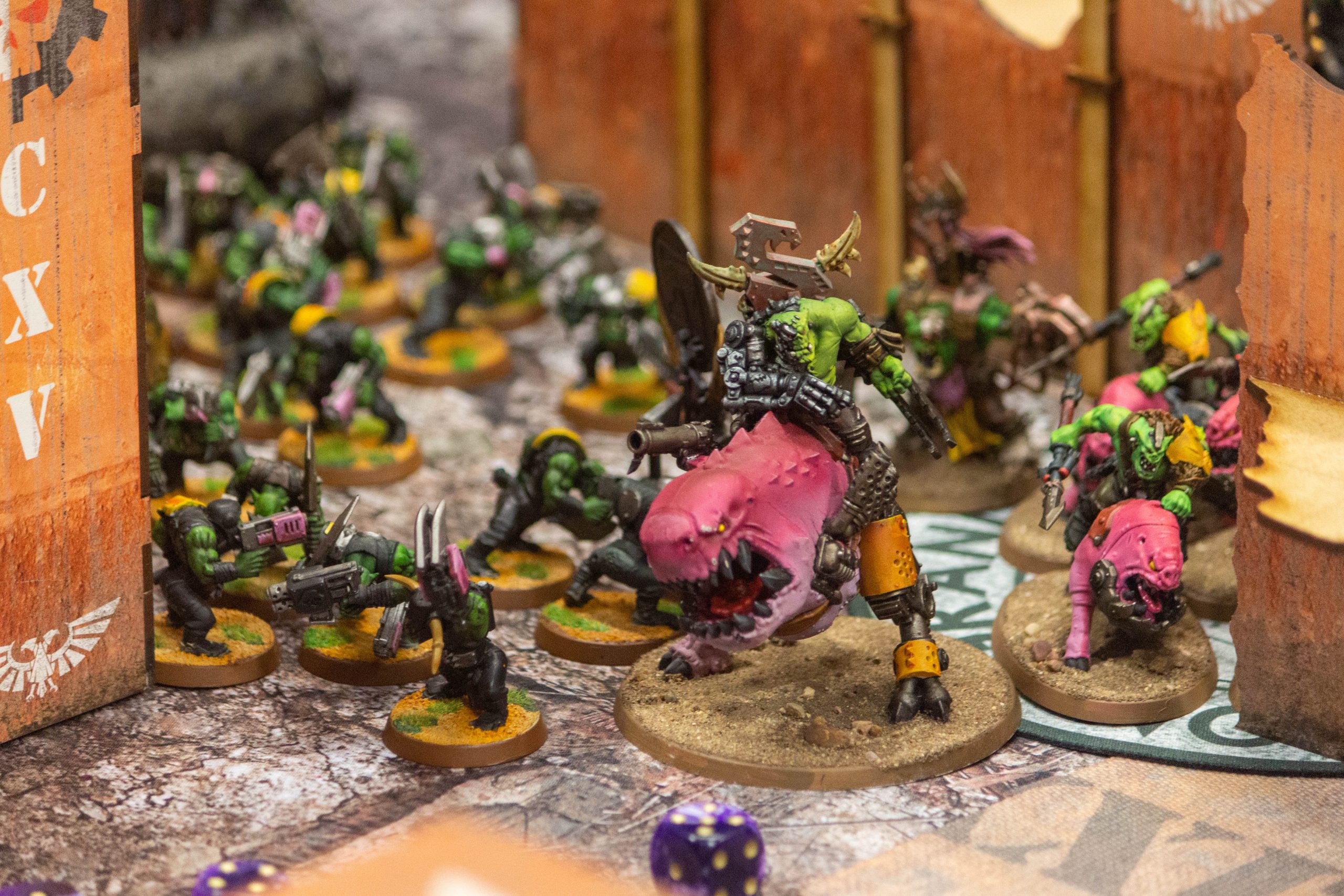 Orks on the prowl at the March 2024 GHOOne of those fun options is to combine the rules from the Green Tide Detachment, a large unit of 20 Boyz, and a Painboy. The Green Tide Detachment rule Mob Mentality gives every BOYZ unit a 5++ and allows them to re-roll 1s if the unit size is 10 or more models. There are two ways to guarantee that the unit is considered to have 10+ models, including the Raucous Warcaller Enhancement (the bearer's unit is considered to have 10 models) and the 1CP Braggin' Rights Stratagem (two BOYZ units within 6" of each other in the Command phase are considered to have 10 or more models for Army purposes). The Painboy gives the unit the Feel No Pain 5+ ability.
