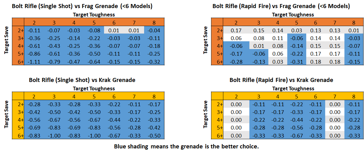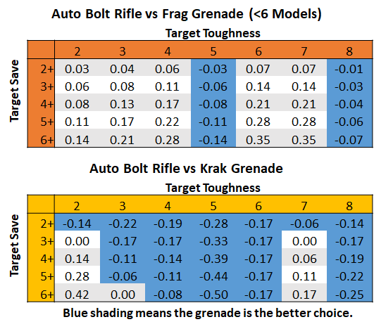 - Against units of 6-10 models the auto bolt rifle is better than frag grenades against T4, T6, and T7 targets.