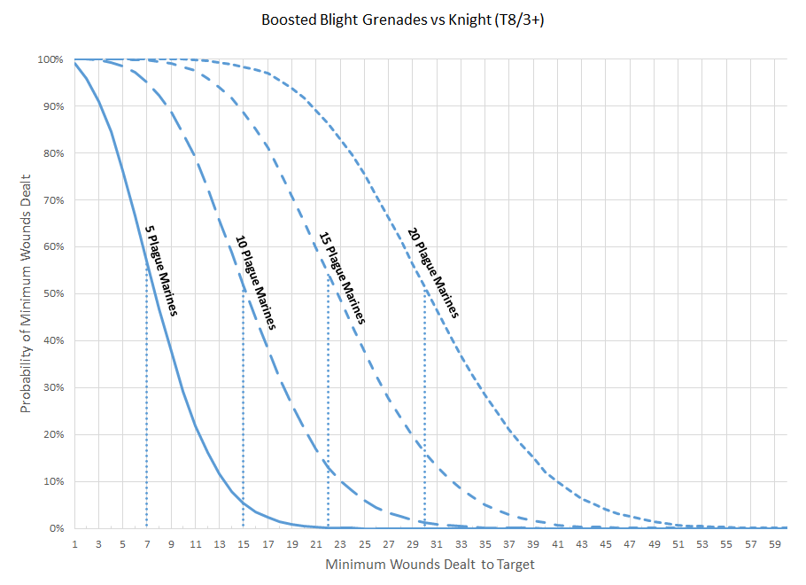 The output of 20 Plague Marines is comparable to Wolf Lord Smashwolf Wolfsmash the 2nd, albeit at a much higher price. This could be further improved with the addition of a Chaos Lord to allow the extensive number of shots to be re-rolled; in that situation 15 Plague Marines is enough to reliably take down a Knight. That said there is no obligation to attack a single target; all of the bonuses are on the unit and as a result Papa Nurgle's gifts could be spread out to a wide variety of potential hosts.