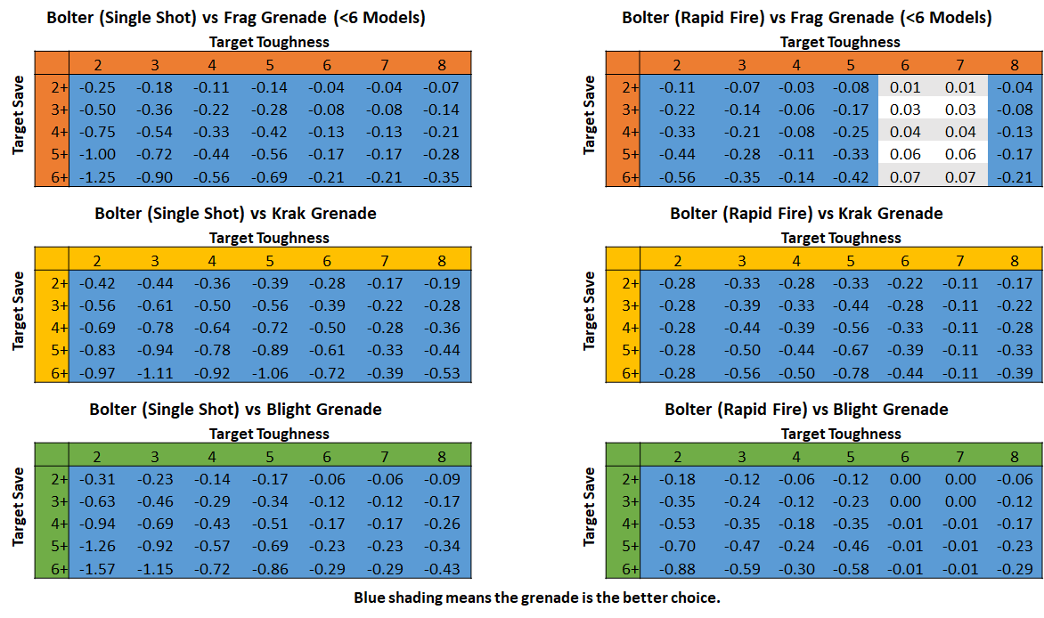 - The charts in the section above summarize the details, but in general bolters and lasguns are inferior to frag, krak, and blight grenades.