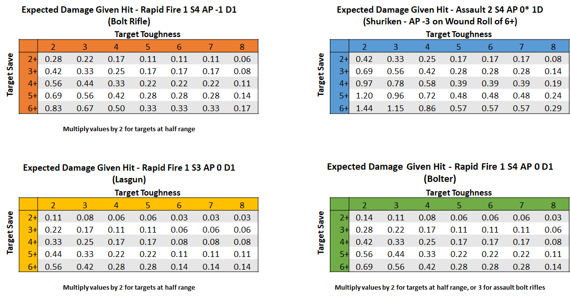 I also examined the plasma grenade to the shuriken catapult and the plasma grenade was the superior option in every case. There's a lot to parse through here so the major takeaways are below: