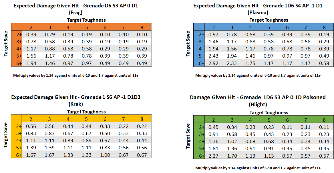 And we do the same chart for several common weapons fielded by the models which use those grenades.