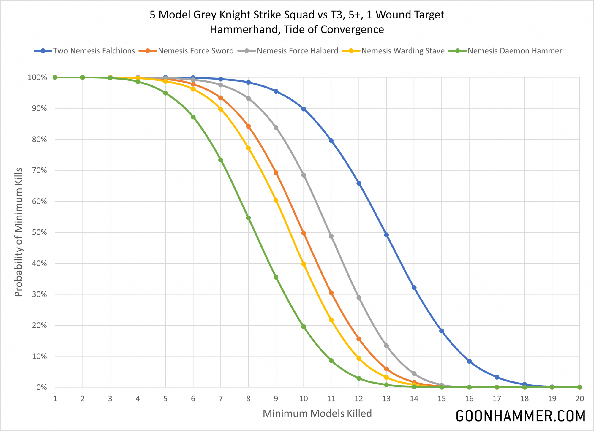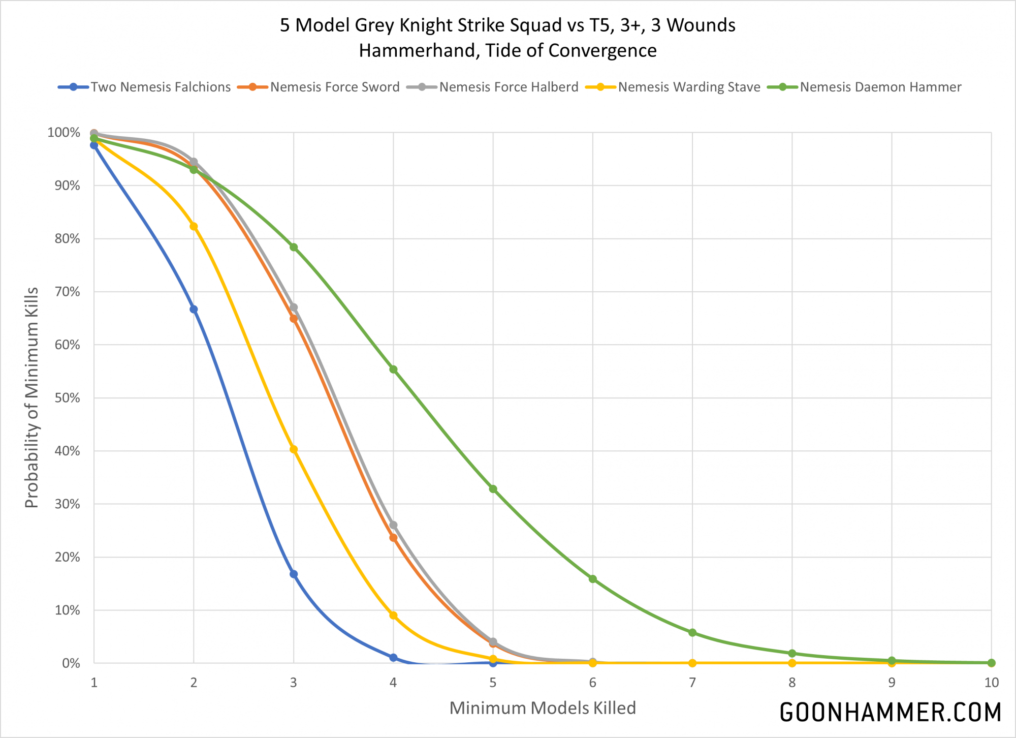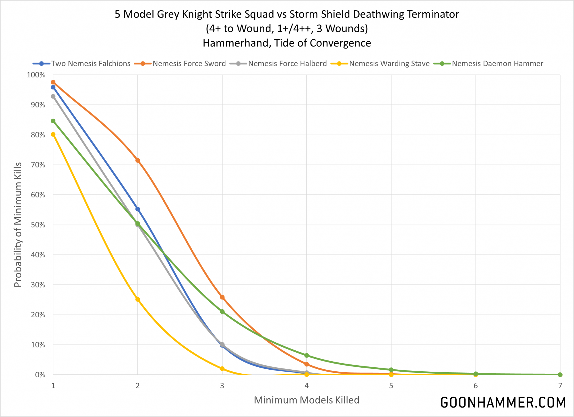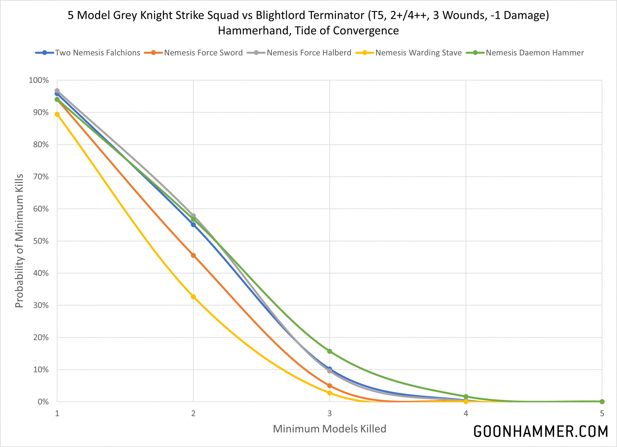 - The daemon hammer is more effective against certain 3W targets (but not all), but the difference in average kills doesn't seem to justify the 10 point cost penalty.