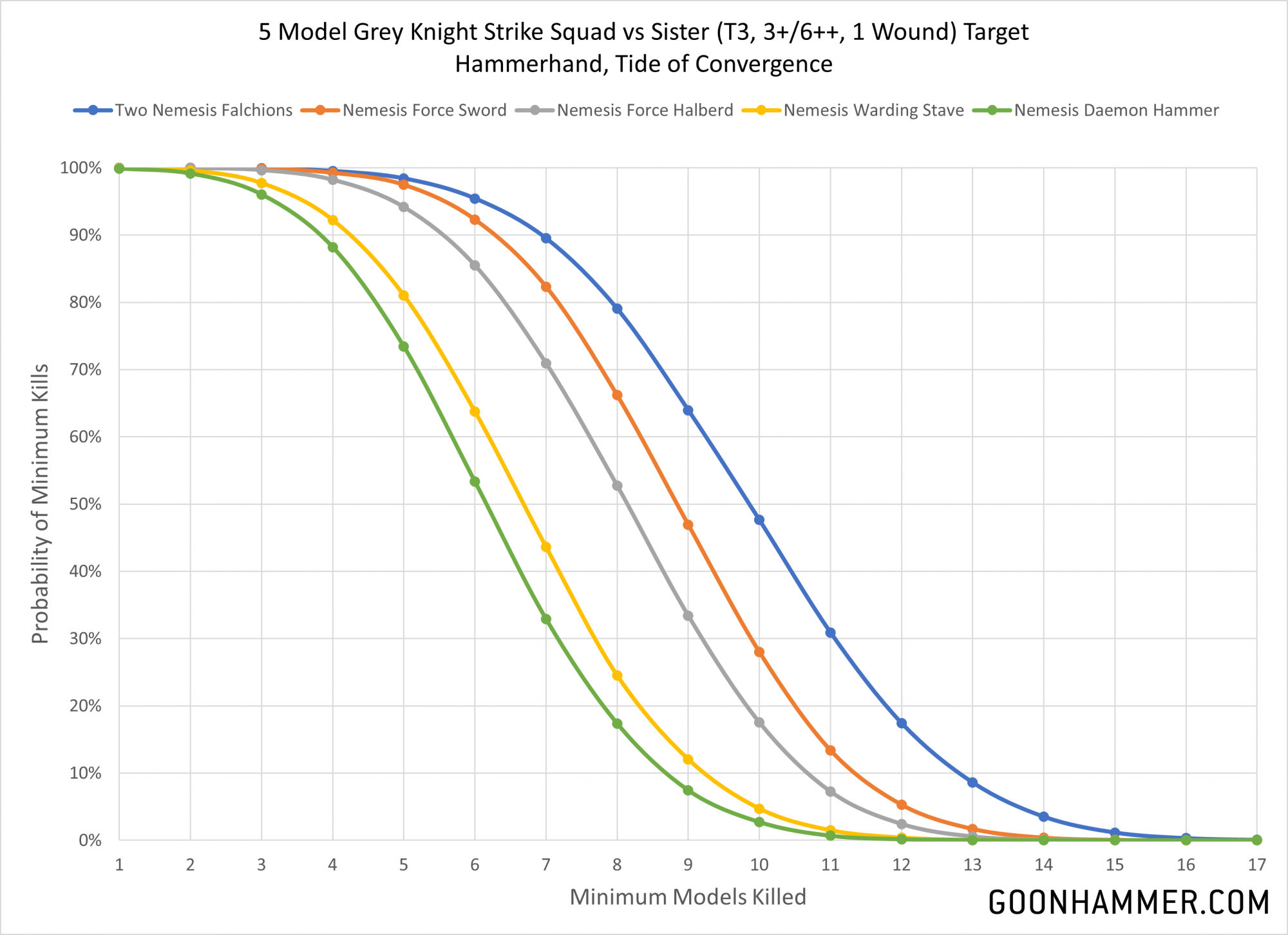 Most Grey Knights have the profile of an Astartes but trade Shock Assault for an extra base attack, giving them 3 attacks hitting on a 3+ at S4 before the weapon bonus. At 22 points it's a pretty solid investment. For the purpose of this exercise we'll use a Strike Squad of 5 including the Justicar, act as if the Hammerhand power was active to re-roll wounds, and assume that the Tide of Convergence is active so that every unmodified wound roll of 6 inflicts a mortal wound (to a cap of 6).