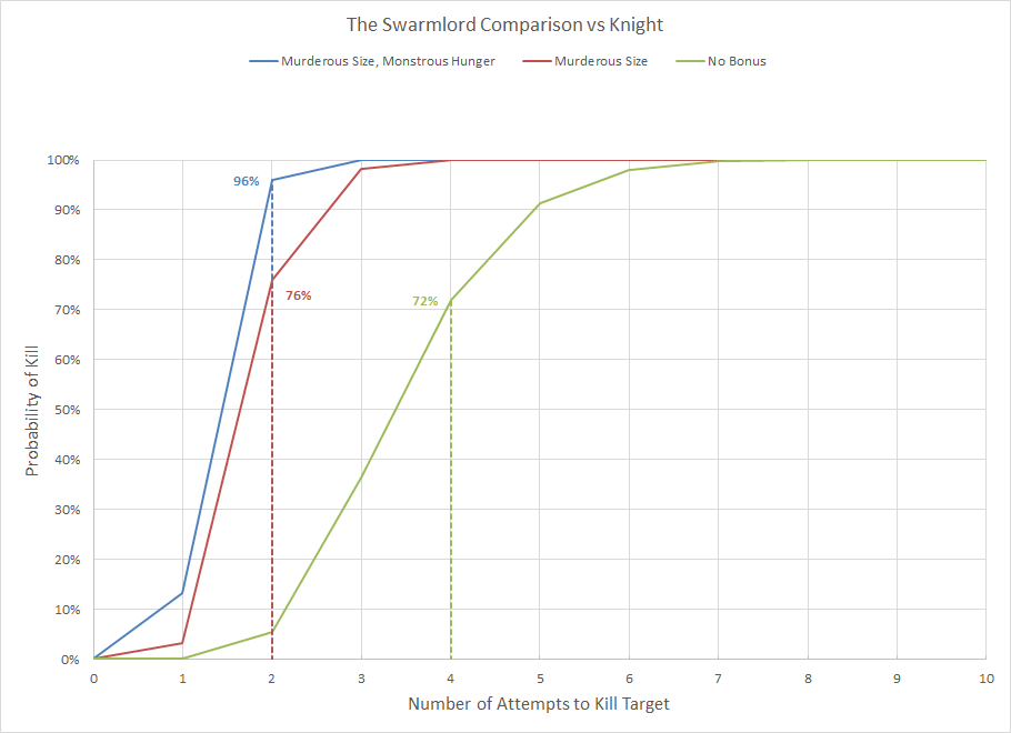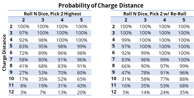 The chart above was created by simulating 10,000 rolls for each condition; because it's not a perfect result the values may be off a percent due to rounding. This provides us with some really interesting probabilities. Potentially a unit that you REALLY want to get somewhere could be rolling as much as 4d6 (technically 5d6 if it's a Scythed Hierodule), dropping the two lowest, and re-rolling. Assuming the attacking units meets the criteria of Hive Instinct or Synaptic Enhancement and gets 1 model within 1" of the designated target then it could also be used to multi-charge a huge number of threats. We also see that the benefit of the Arachnacyte Gland comes into its own when combined with a re-roll; the probability of making a 9" charge is 78%. Behemoth might be seeing a resurgence.