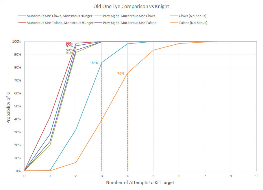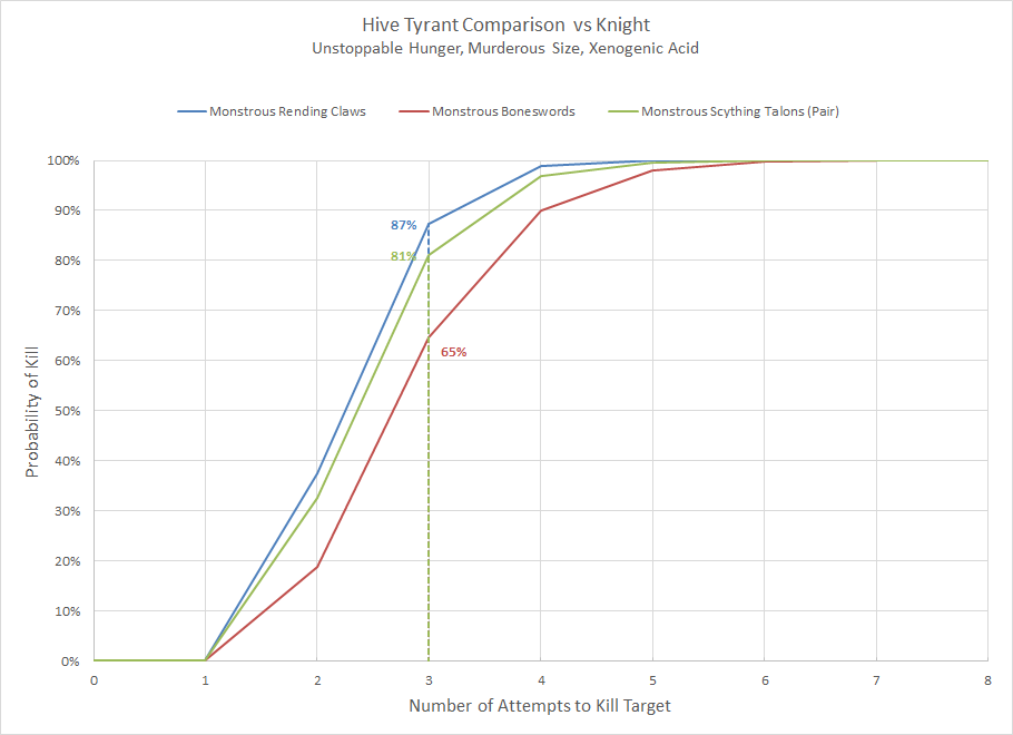 Old One Eye could be even more terrifying. He could boost his crushing claws (S15, AP -4, D4, but -1 to hit) or his monstrous scything talons (S8, AP -4, D4, re-roll 1s to hit). Against T8 the Unstoppable Hunger power would also be of use. An alternative configuration is with a custom Hive Fleet; giving him Prey-Sight would result in a +3 bonus to hit and potentially trigger extra attacks on a hit roll of 3+. As you can see in the chart above every approach provides a massive benefit over the baseline model. Given the choice I would probably apply Murderous Size to the claws, as the benefits are nearly equivalent to the talons option but do not require a power to go off.