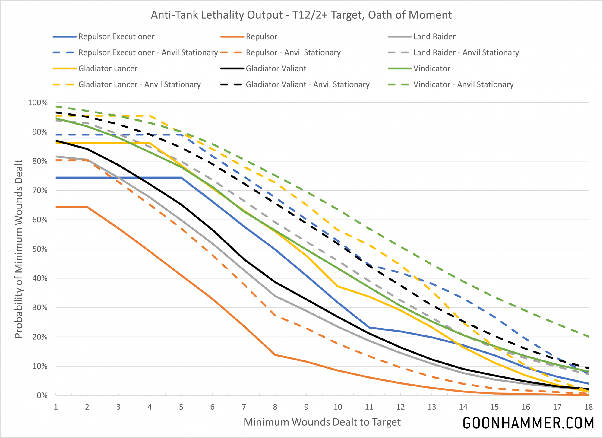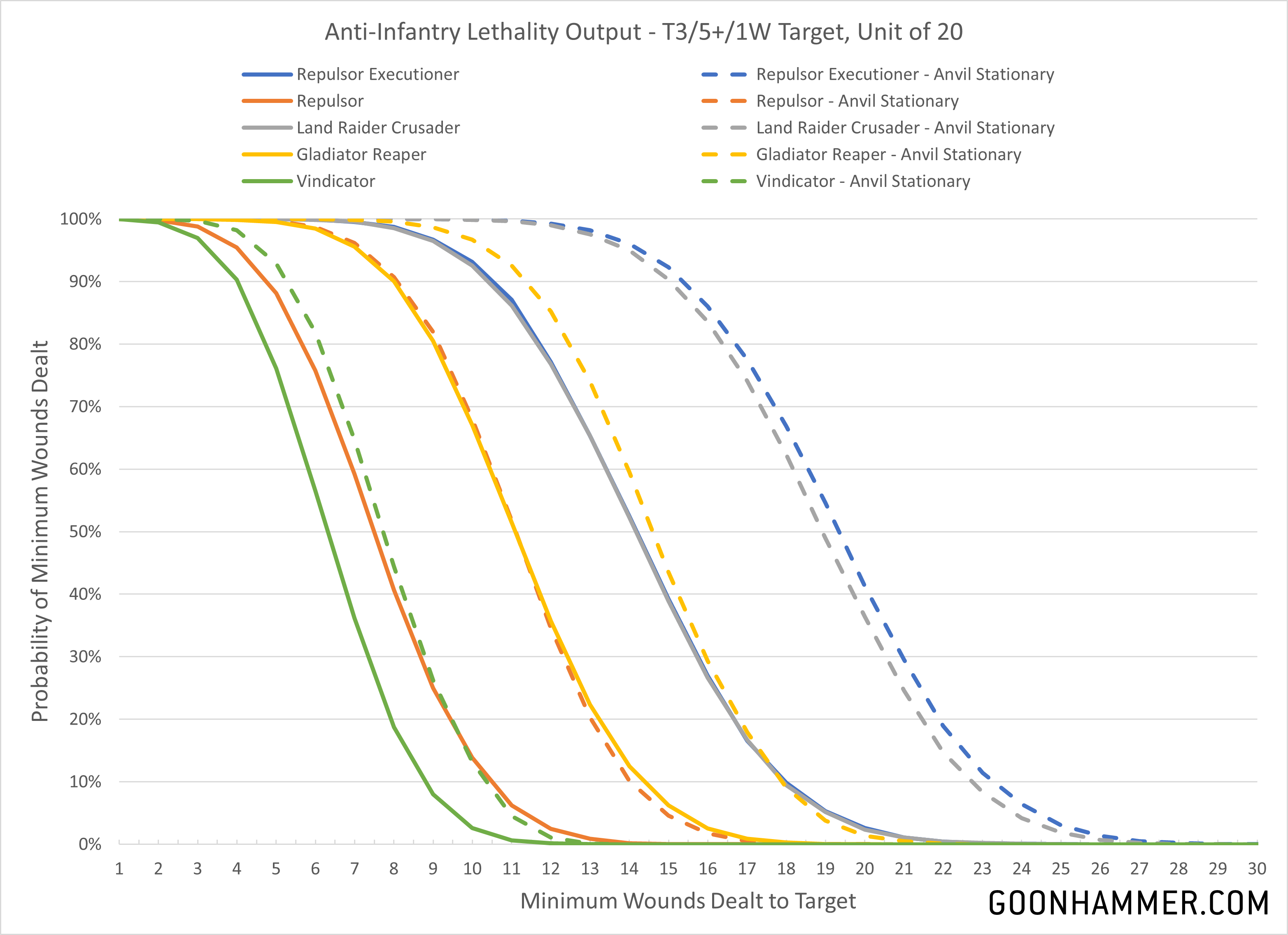 First up we'll take a look at the anti-tank output of the various platforms. The target is a T12/2+ threat that we have applied Oath of Moment to for re-rolling hit rolls. I'm only using the dedicated anti-tank weapons for the chart below because adding in every minor gun does very little to the end result and takes quite a bit of time. From the results you can immediately see why the Vindicator costs so much; it's extremely good at destroying high value targets. Although the variance is high, 50% of the time it's dealing at least 9 wounds to the T12 target without any modifiers. Add in the stationary bonus from an Anvil Siege Force and they average 12 wounds. The output of the Lancer is very strong, matching the Vindicator thanks to the high damage floor. The Repulsor Executioner performs close to the output of the Lancer; where the RepEx has more damage the Lancer has those amazing re-rolls.