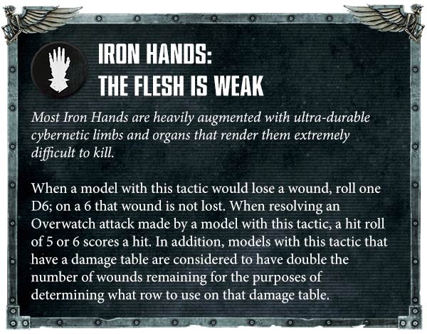 Let's start with a review of what Iron Hands already had: Their Chapter Tactic gives the entire army the ability to ignore damage taken on a 6+ (this is often referred to as a '6+++'). This gives every model - and more importantly for our analysis, every vehicle - an effective increase in wounds. It also gives them the ability to double the number of Wounds they have when determining which degrading profile to use, so even once you start shooting at an Iron Hands vehicle, you'll have to take it down to 25% health to even see an impact. Finally, it allows vehicles to hit with overwatch on a 5+, but we don't care as much about that for the purposes of this article.