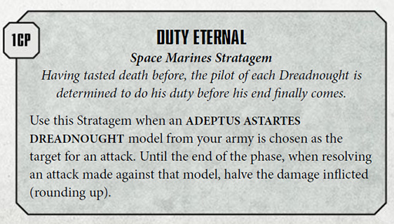 Credit: Games WorkshopThe other rule that we're going to spend a lot of time on in this article is the Duty Eternal Stratagem from the new Codex: Space Marines. This Stratagem lets a DREADNOUGHT model halve all incoming damage (rounding up) for a single phase.