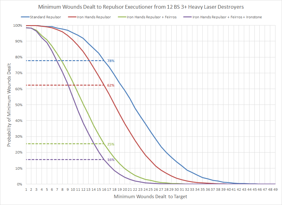 Minimum damage probability curves for 12 Heavy Laser Destroyers against a Repulsor chassis under various Iron Hand options. Holy shit.For a standard Repulsor, we can see that three Executioners firing their Laser Destroyers have a 78% chance of dealing the 16+ damage required to take out the tank. This high probability is not particularly surprising: Between the lack of an invulnerable save and having Toughness 8, the Repulsor is no match for that level of firepower. This has been a historic problem for Space Marines, particularly in an environment where Knights (with 8 Toughness and a 5+ invulnerable save that can be improved to 4+) are common, and armies have to be able to deal with them. The simple addition of a 6+ "Feel No Pain" save to the Repulsor reduces the probability of a one-volley death to 62% probability of kill; a 16% decrease from the Chapter Tactic alone. Adding Feirros is where things get particularly interesting, as the 5+ invulnerable save aura provided by the Iron Father causes the probability of a one-turn kill to plummet down to 25% as a vehicle that previously had no save against the incoming damage can now shrug off one third of the wounding shots. Finally the presence of the Ironstone provides a relatively modest decrease, bringing the final value down to 16%. Note that any army that fields Feirros is going to be healing a vehicle for at least 3 wounds a turn (and possibly as much as 6 + d3 with the appropriate psychic power and Stratagem), reducing even a partial success, while the Iron Hands' Chapter Tactic will ensure that a vehicle with more than one fourth of its wounds remaining will still act at full effectiveness.