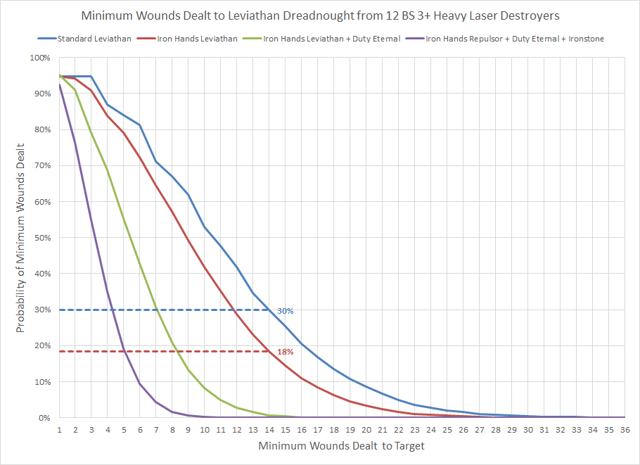 Minimum damage probability curves for 12 Heavy Laser Destroyers against a Leviathan under various Iron Hand options. This is ridiculous.Here's a riddle for you: How do you kill an Iron Hands Leviathan? The answer: YOU DON'T. The 4+ invulnerable save made the Leviathan already vastly more survivable than the baseline Repulsor in spite of having fewer wounds but the same toughness. As with the Repulsor, the 6+ Feel No Pain roll causes a considerable reduction in the effectiveness of incoming attacks, but once you halve the damage via the Duty Eternal Stratagem the probability of dealing at least 14 wounds with a single turn of firing from 3 Executioners falls below 1%. By this point adding the Ironstone almost feels superfluous, but it should be noted that with the Ironstone Relic and the Duty Eternal Stratagem the 12 Heavy Laser Destroyer shots will deal fewer than 6 wounds to a Leviathan 90% of the time. In other words 90% of the time the damage dealt by 3 Repulsor Executioners can be fully repaired via the Iron Father and Machine Empathy in the following turn. Or just ignored since, again, it will be able to act at its full profile most of the time.