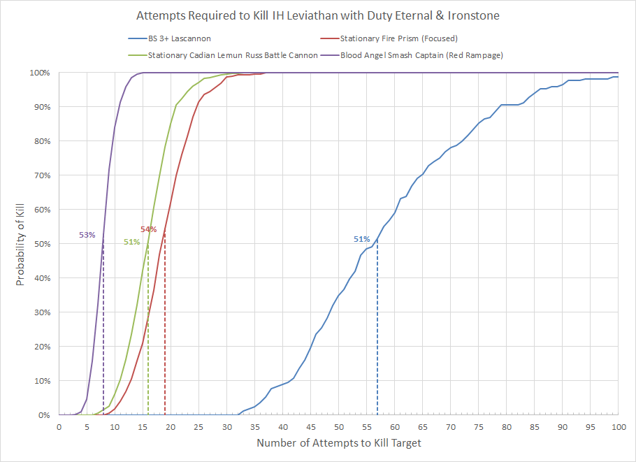 Probability distribution for the number of attempts required to kill an Iron Hands Leviathan Dreadnought with the Duty Eternal Stratagem and the Ironstone Relic. The line represents the probability curve for each attack; dashed lines are the number of attempts required to kill the target 50% of the time.To read this chart, find the line for the weapon you want to examine and then look up the number of attempts on the x-axis to see what the chances of that many attempts killing a Leviathan is. The dashed lines show the number of attempts that will kill the target half the time. For example, it takes around 8 rounds of combat for a Blood Angels Smash Captain to deal the 14 wounds needed to kill the Leviathan Dreadnought. That's only an average of 64 attacks; seems perfectly fine, right? It should be noted that the combination of Duty Eternal and Ironstone Relic is particularly nasty to the poor Smash Captain's thunder hammer; instead of doing 4 damage with each hit, the weapon will now only do 1. When facing Iron Hands armies you're going to want to focus fire on whatever character is carrying the Ironstone first; otherwise you're likely to be just wasting shots. Thanks to the order of operations for math (multiplication before subtraction) any weapon with damage value below 5 will only take off a single wound each time it attacks at an Iron Hands dreadnought affected by these buffs.