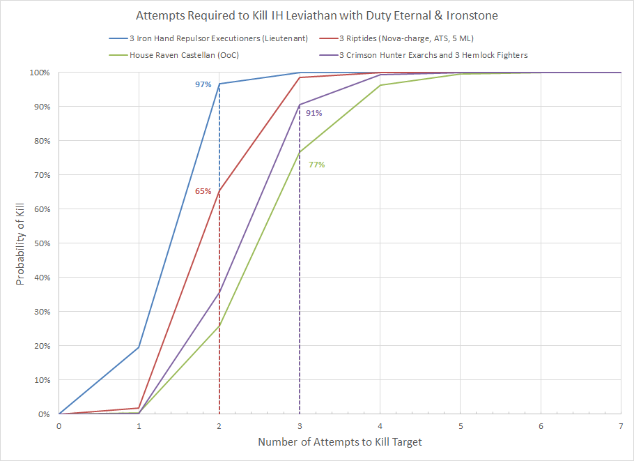 Probability distribution for the number of attacks required to kill an Iron Hands Leviathan Dreadnought with the Duty Eternal Stratagem and the Ironstone Relic. This time we toss some real tournament-grade bullshit at it.Here we see some examples of focus fire. Three Repulsors (with rerolls on 1s for both hits and wounds) will kill the Leviathan in two turns around 97% of the time. Three Riptides will only pull it off 65% of time in two turns. Things look even worse for a complete squadron of Eldar Flying Bullshit, requiring three turns to have a solid chance at killing the Leviathan. Note that this does not include the mortal wounds that the Hemlocks can produce, which will likely be the strongest source of damage. The swoopy Eldar bastards also have the best chance of taking out the Relic hauler who needs to stay close to the Leviathan to get the last bit of damage reduction. Finally we have the once-feared House Raven Castellan using Order of Companions; in spite of all of those re-rolls it needs three turns to have a decent chance of killing the dreadnought.